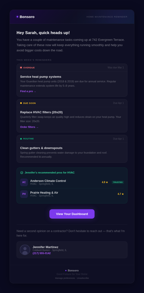 Bonsoro sends beautifully designed maintenance reminders to your clients — with your name, photo, and contact info. Each email is a gentle touch point that reminds them who helped them find their home.